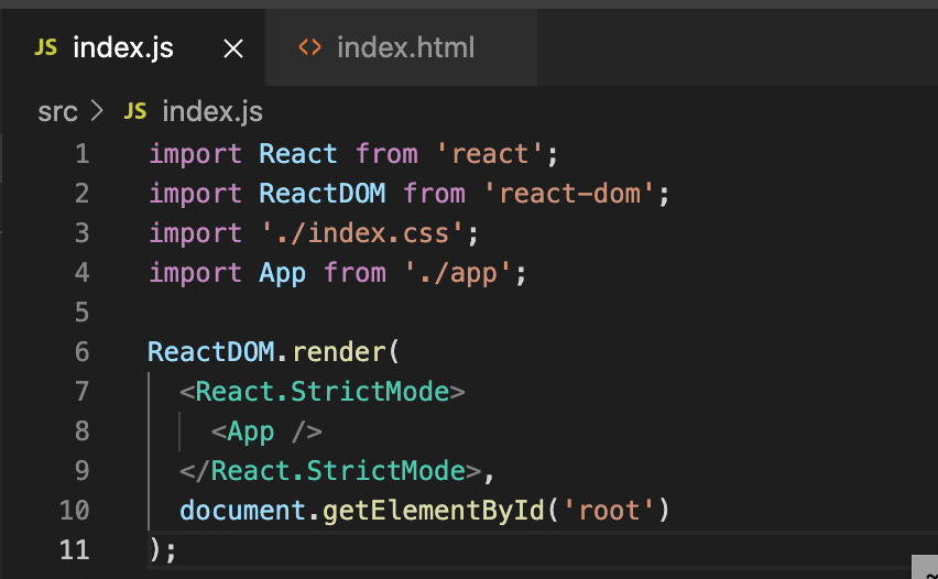 -> 가져온 클래스를 render함수를 이용해서 document페이지에 있는 아이디가 root를 가져와서 그 요소의 root컴포넌트를 연결해준다.