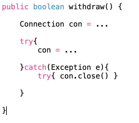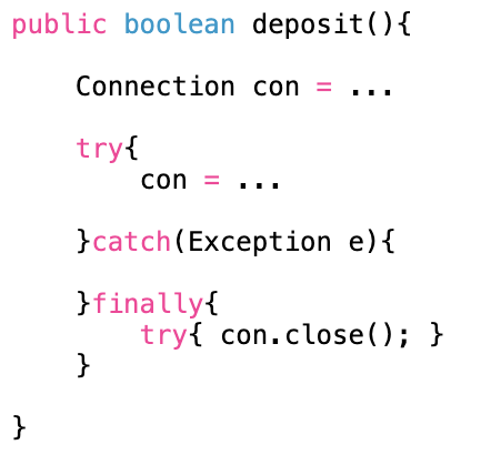 - deposit()과 withdraw()는 각자 고유하게 데이터베이스와 커넥션을 맺고 작업을 처리한다. 이 떄, 문제는 withdraw()는 정상적으로 처리되었는데, deposit()에서는 예외가 발생하는 경우이다. 이미 하나의 계좌에서는 돈이 빠져나갔지만, 상대방의 계좌에는 돈이 입금되지 않은 상황이 발생할 수 있다.