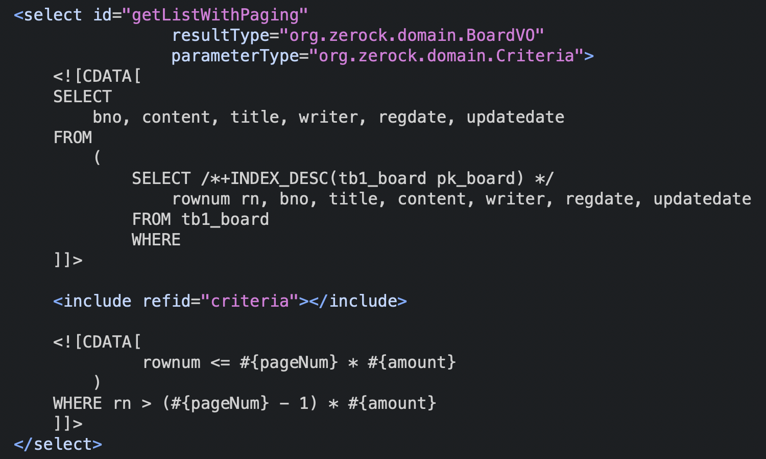 - MyBatis는 SQL을 그대로 사용할 수 있기 때문에 인라인뷰를 이용하는 SQL을 작성하고, 필요한 파라미터를 지정하는 방식으로 페이징 처리를 할 수 있다.