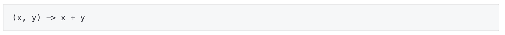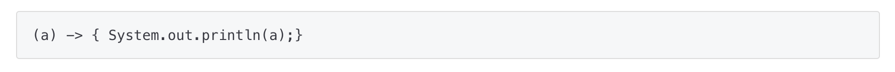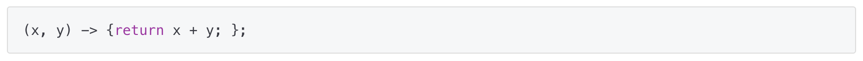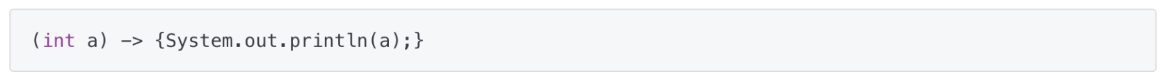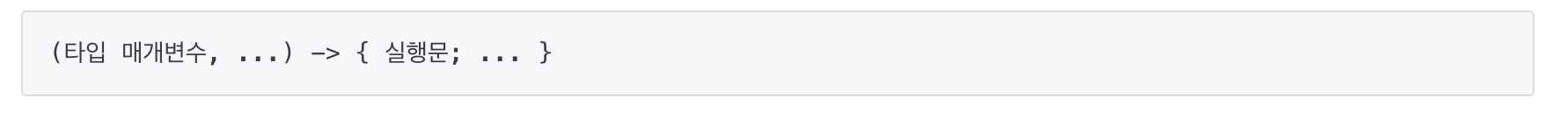 - 람다식의 형태는 매개 변수를 가진 코드 블록이기 때문에 마치 JAVA의 메소드를 선언하는 것처럼 보여진다.