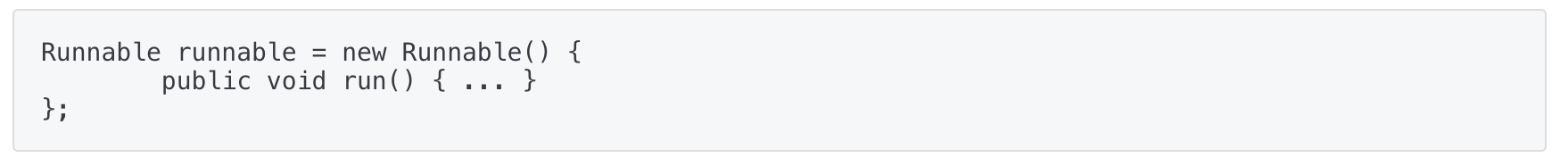예를 들어 Runnable 인터페이스의 익명 구현 객체를 생성하는 전형적인 코드는 다음과 같다.