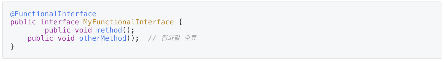 - 함수적 인터페이스를 작성할 때 2개 이상의 추상 메소드가 선언되지 않도록 컴파일러가 체킹해주는 기능이 있는데, 인터페이스 선언시 @functionalInterface 어노테이션을 붙이면 된다. 이 어노테이션은 2개 이상의 추상 메소드가 선언되면 컴파일 오류를 발생시킨다.
