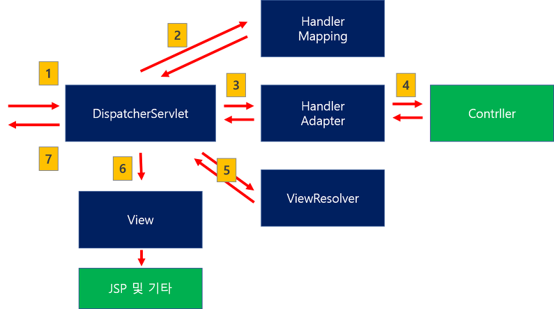 - 사용자의 Request는 Front-Controller인 DispatcherServlet을 통해서 처리한다.