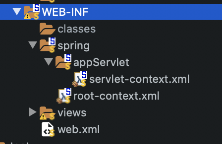 - Spring Legacy Project로 생성한 예제의 경우에도 servlet-context.xml과 root-context.xml로 설정 파일이 분리된 것을 볼 수 있다.