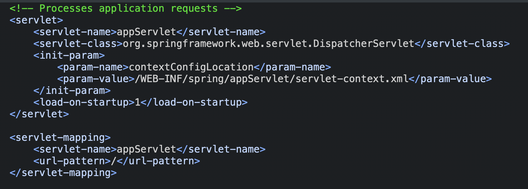 - 생성된 프로젝트의 web.xml을 보면 Request를 DispatcherServlet이 받도록 처리하고 있다.