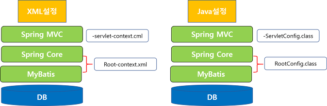 - 스프링 MVC 프로젝트를 구성해서 사용한다는 의미는 내부적으로 root-context.xml로 사용하는 일반 Java 영역(흔히 POJO(Plain Old Java Object)과 servlet-context.xml로 설정하는 Web 관련 영역을 같이 연동해서 구동하게 된다.