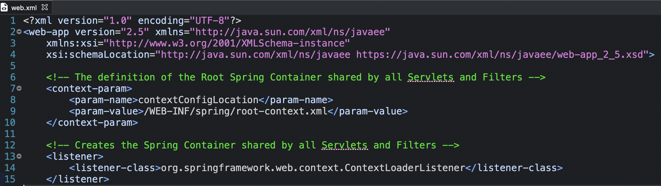 - <context-param>에는 root-context.xml의 경로가 설정되어 있고, <listener>에는 스프링 MVC의 ContextLoaderListener가 등록되어 있다.