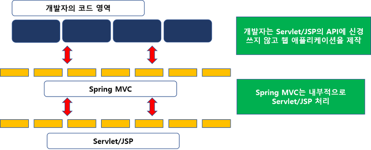 - 스프링 MVC를 이용하게 되면 개발자들은 직접적으로 HttpServletRequest/HttpServletResponse 등과 같이 Servlet/JSP의 API를 사용할 필요성이 현저하게 줄어든다.