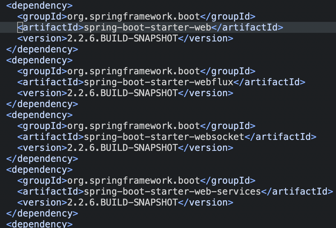 - 이 수많은 설정 중에 선택한 spring-boot-starter-web starter가 있으며, 이 설정에는 버전 정보까지 명시되어 있다.