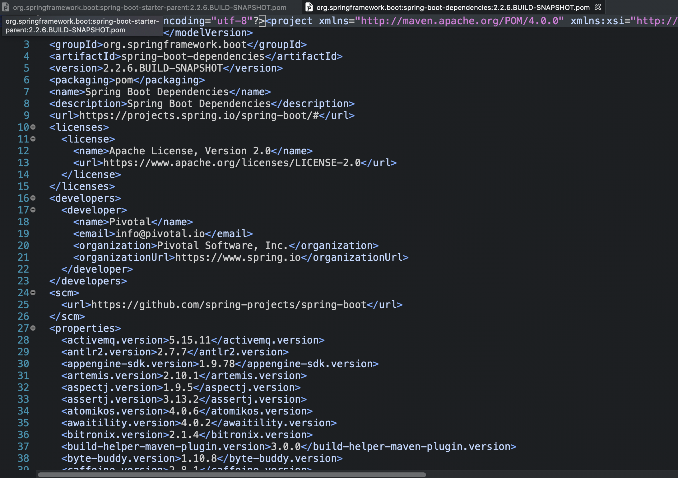 - 이곳에 엄청많은 <property>와 <dependency>가 설정되어 있으며, 이 의존성 설정들이 우리가 만든 프로젝트에 상속된 것이다.