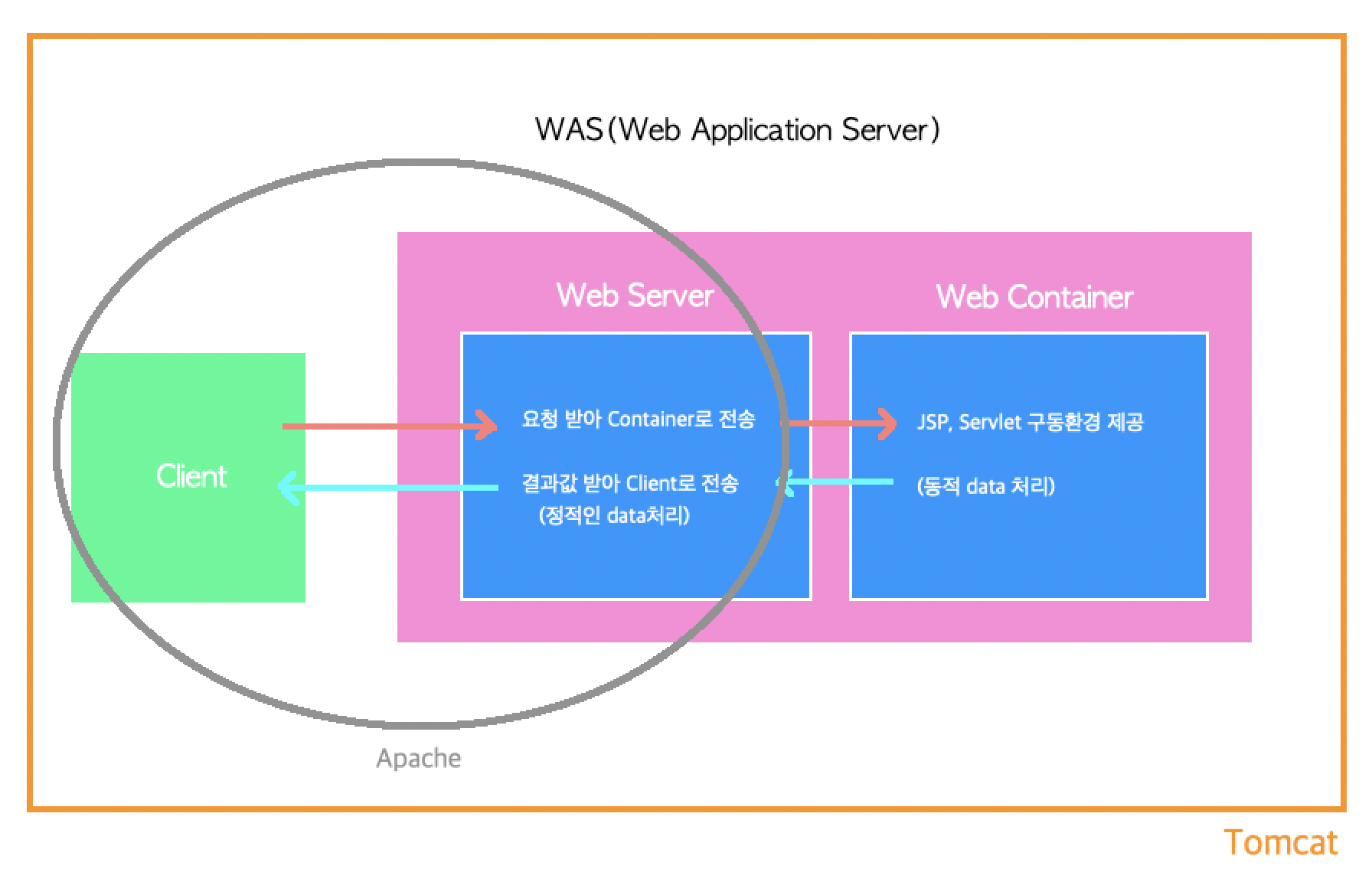 - Tomcat(WebContainer)만 사용하면 동적인 웹페이지 처리가 가능하지만 Apache에서 필요한 기능을 못 가져온다. 또한 여러 사용자가 요청할시에는 과부하에 걸릴 수 있다.