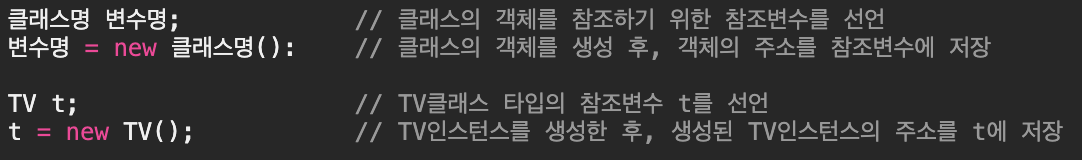 - 원하는 기능의 객체를 사용하기 위해서는 먼저 클래스부터 객체를 생성하는 과정이 선행되어야 한다. (TV를 보기 위해서는 , TV라는 객체가 필요한 것이지 설계도(클래스)가 필요한 것은 아니며, 설계도는 단지 객체를 만드는 데만 사용될 뿐이다.)