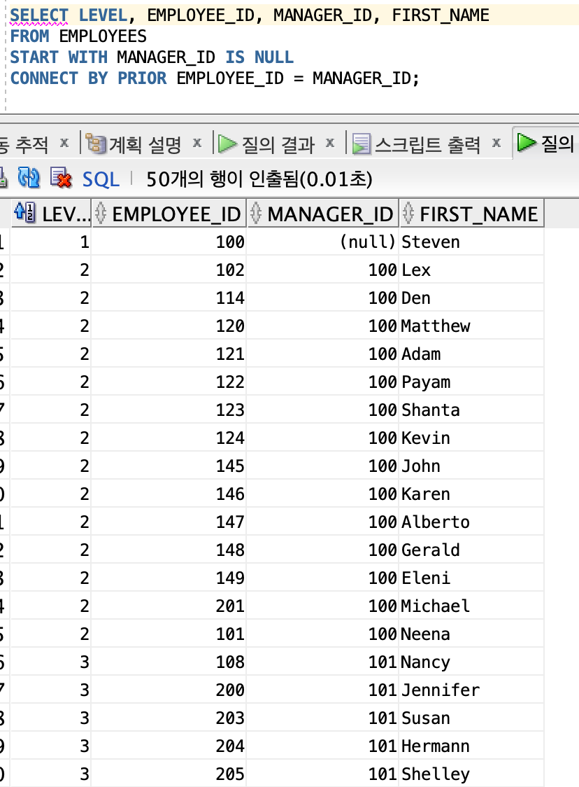 | LEVEL | 검색 항목의 깊이를 의미한다. 즉, 계층구조에서 가장 상위 레벨 1이 된다. |