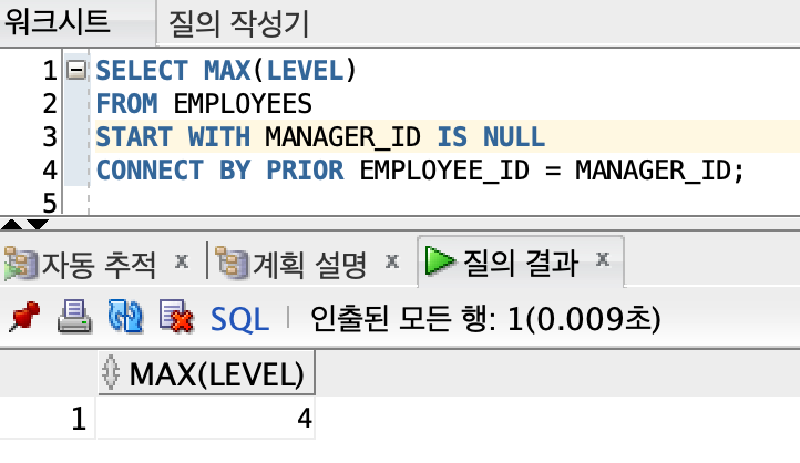 ∙ 계층형 조회에서 최대 계층의 수를 구하기 위한 문제, MAX(LEVEL)을 사용하여 최대 계층 수를 구한다. (즉, 게층형 구조에서 마지막 Leaf Node의 계층 값을 구한다.