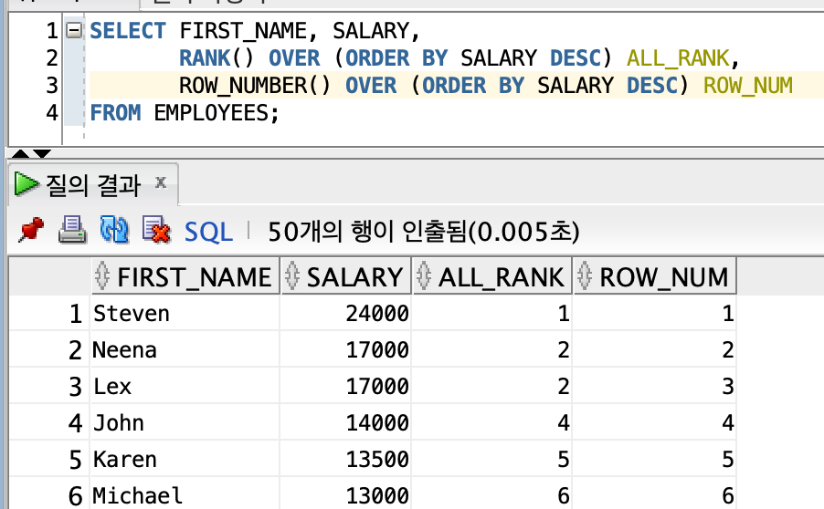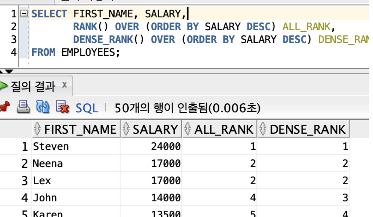 ∙ RANK() OVER(ORDER BY SALARY DESC)는 SALARY로 등수를 계산하고 내림차순으로 조회하게 한다.