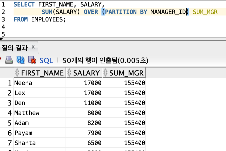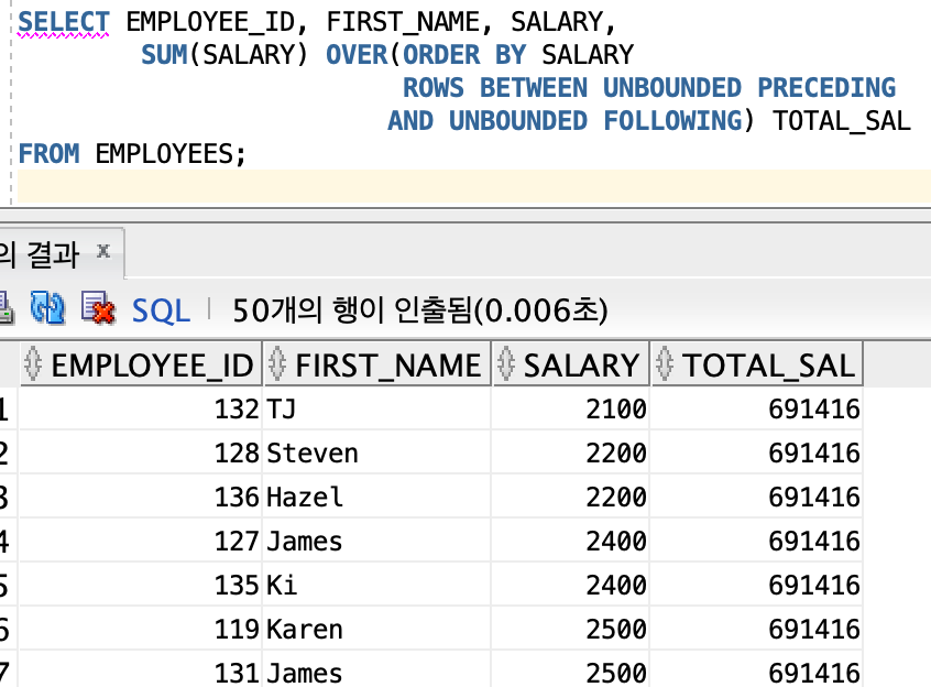 ∙ UNBOUNDED PRECEDING은 처음 행을 의미하며, UNBOUNDED FOLLOWING은 마지막 행을 의미한다.