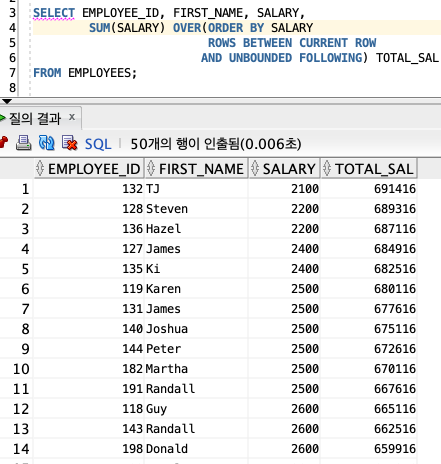 ∙ 위 SQL문은 현재 행(CURRENT ROW)부터 마지막 행(UNBOUNDED FOLLOWING)까지의 합계를 계산한다.