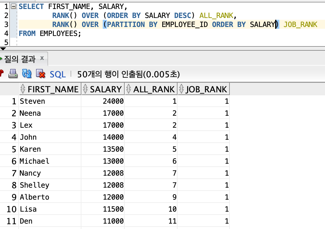 ∙ RANK() OVER(PARTITION BY EMPLOYEE_ID ORDER BY SALARY DESC)는 JOB으로 파티션을 만들고 EMPLOYEE_ID별 순위를 조회하게 한다.