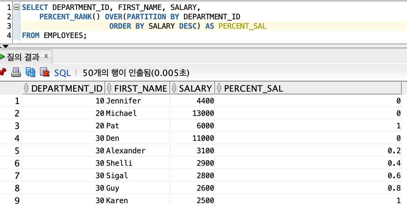 | PERCENT_RANK | 파티션에서 제일 먼저 나온 것을 0으로 제일 늦게 나온 것을 1로 하여 값이 아닌 행의 순서별 백분율을 조회한다. |