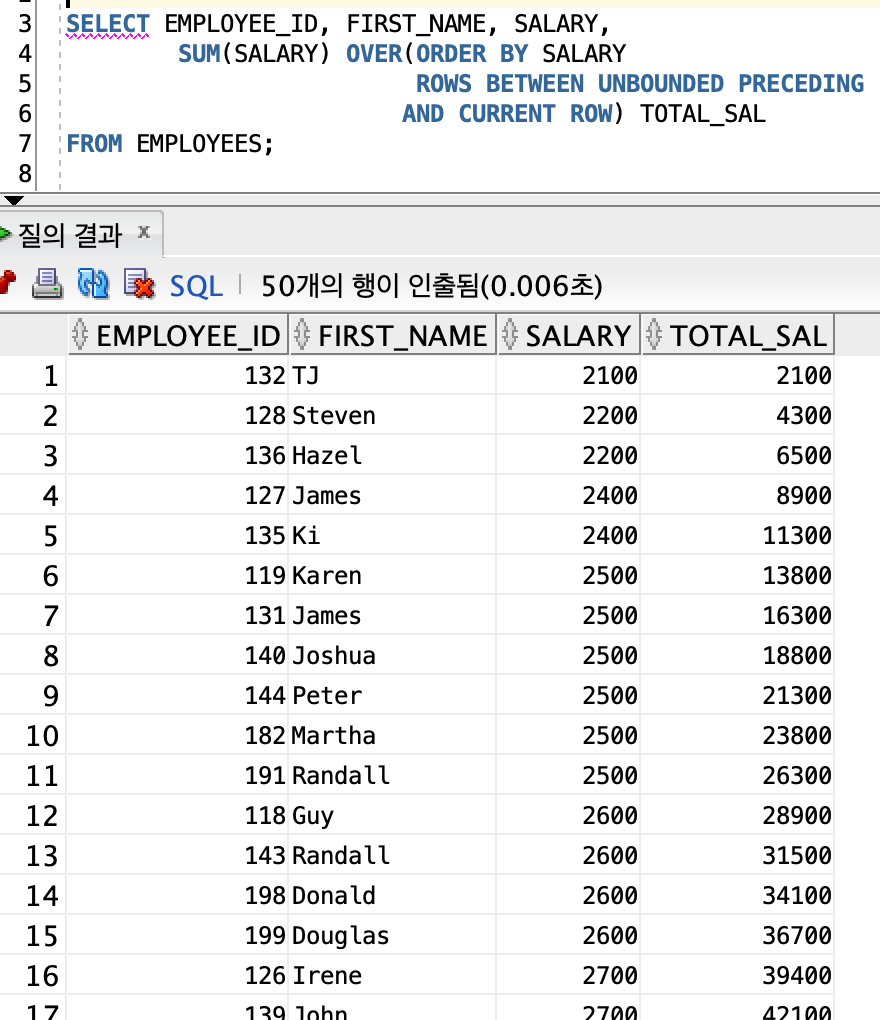 그러므로 TOTAL_SAL에 처음부터 마지막까지의 합계(SUM(SAL))를 계산한 것이다.