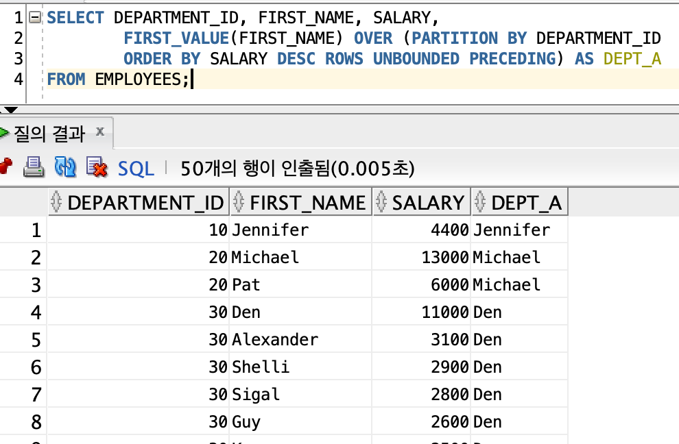 ∙ FIRST_VALUE 함수는 파티션에서 조회된 행 중에서 첫 번째 행의 값을 가지고 온다.