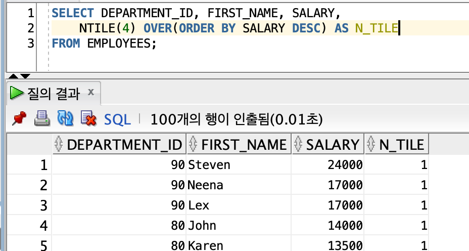 ∙ NTILE(4)는 4등분으로 분할하라는 의미로 위의 예에서는 급여가 높은 순으로 1~4등분으로 분할한다.