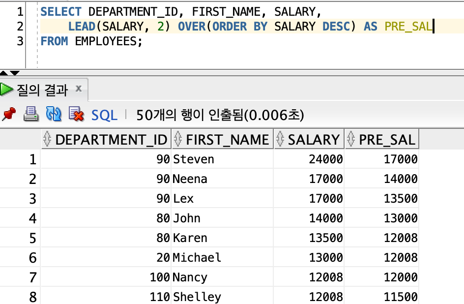 ∙ LAG 함수는 이전 값을 가지고 오는 것이다. 예를 들어 PRE_SAL의 값의 5000값은 SAL의 이전 데이터이다.
