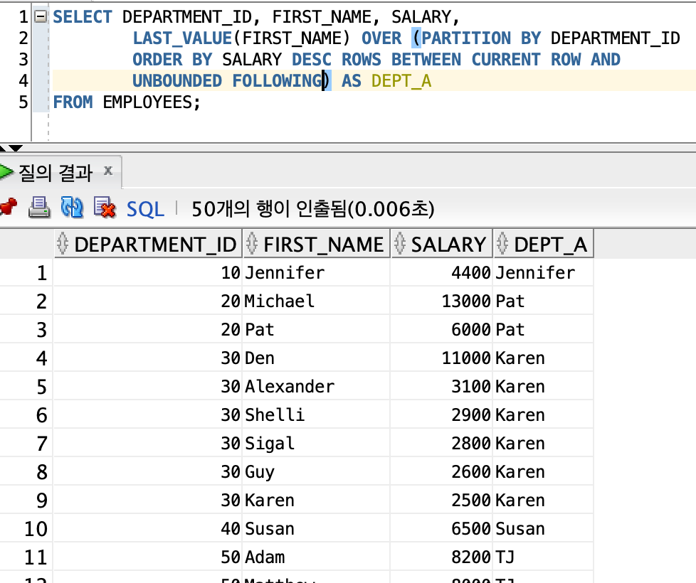 ∙ BETWEEN CURRENT ROW AND UNBOUNDED FOLLOWING의 의미는 현재 행에서 마지막 행까지의 파티션을 의미한다.