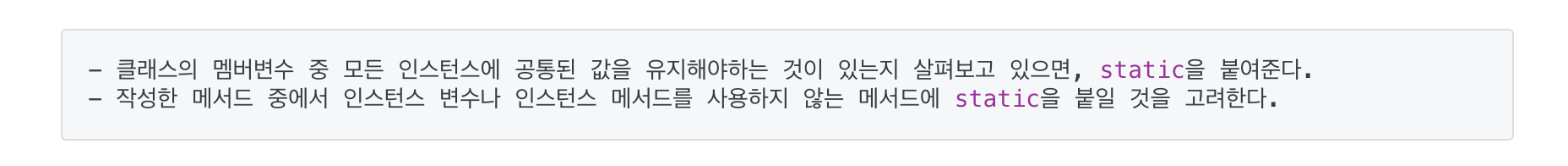 : 메서드의 작업내용 중에서 인스턴스 변수를 필요로 한다면, static을 붙일 수 없다. 반대로 인스턴스변수를 필요로 하지 않는다면 static을 붙인다.