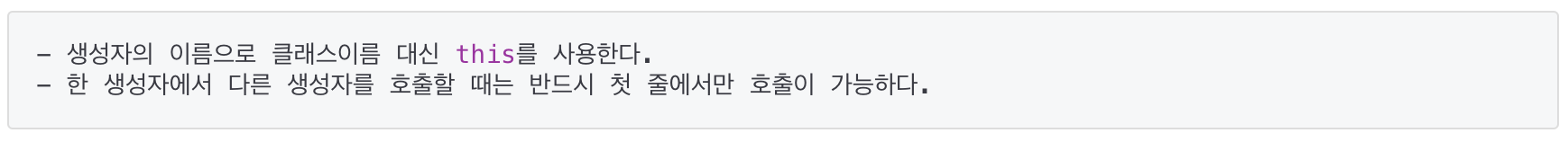 - 같은 클래스 내의 생성자들은 일반적으로 서로 관계가 깊은 경우가 많아서 이처럼 서로 호출하도록 하여 유기적으로 연결해주면 더 좋은 코드를 얻을 수 있다.