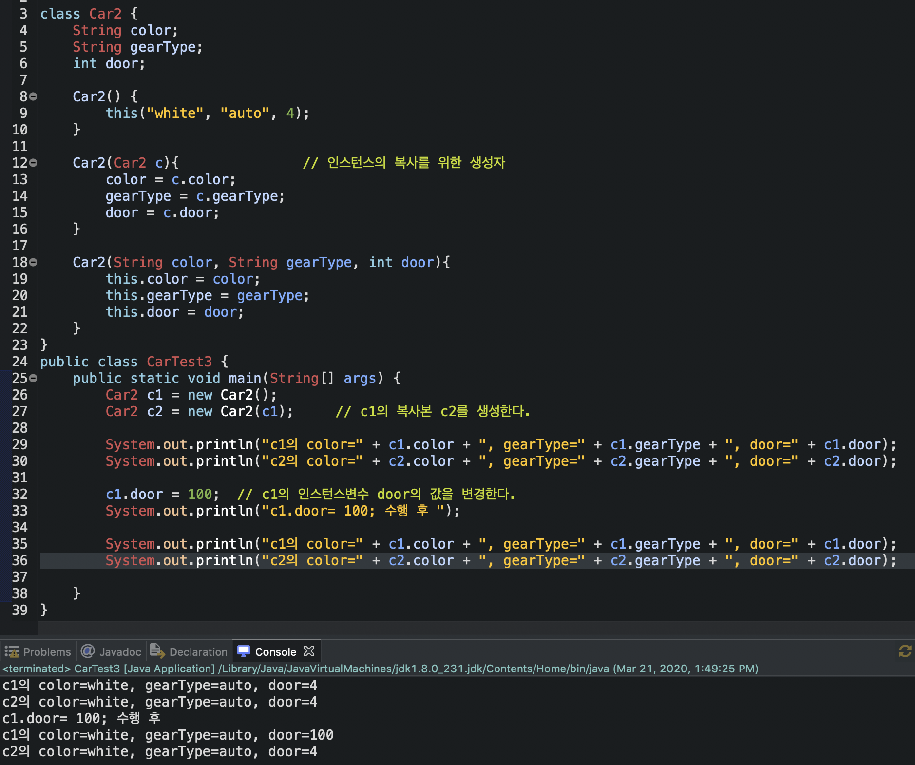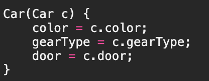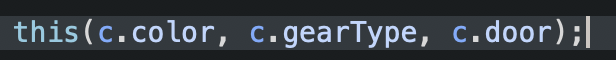 - 생성자('Car2(Car2 c)'는 다른 생성자인 'Car2(String color, String gearType, int door)'를 호출하는 것이 바람직하다.
