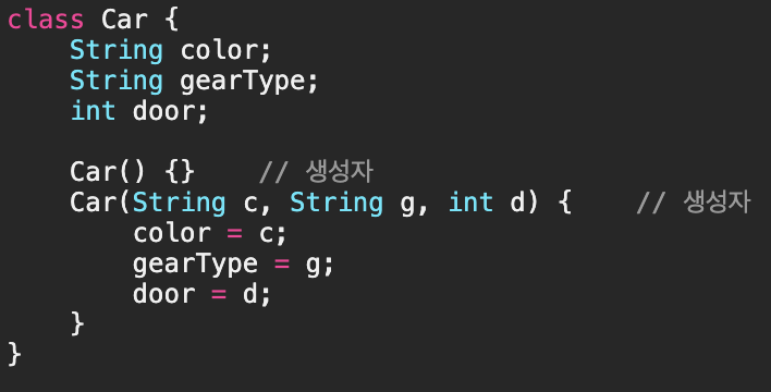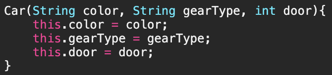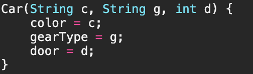 - Car 인스턴스를 생성할 때, 생성자 Car()를 사용한다면, 인스턴스를 생성한 다음에 인스턴스변수들을 따로 초기화해주어야 하지만, 매개변수가 있는 생성자 Car(String color, String gearType, int door)를 사용한다면 인스턴스를 생성하는 동시에 원하는 값으로 초기화를 할 수 있게 된다.