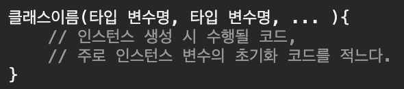 - 생성자 역시 메서드처럼 클래스 내에 선언되며, 구조도 메서드와 유사하지만 리턴값이 없다는 점이 다르다.
