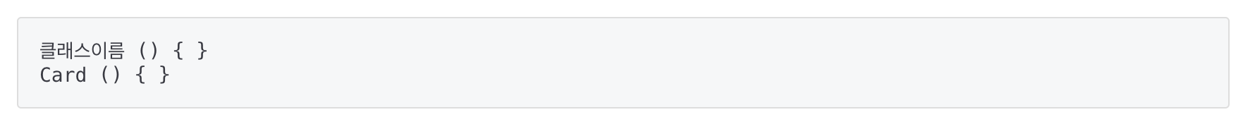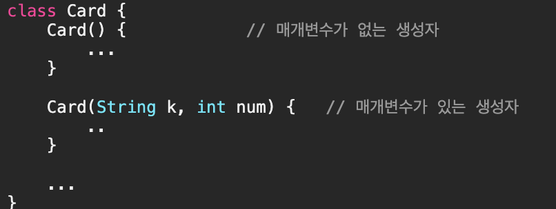 + 생성자도 메서드이기 때문에 리턴값이 없다는 의미의 void를 붙여야 하지만, 모든 생성자가 리턴값이 없으므로 void를 생략을 할 수 있게 하였다.
