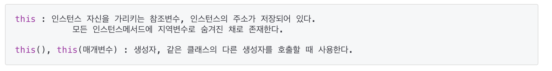 - 'this'는 참조변수로 인스턴스 자신을 가리킨다. 참조변수를 통해 인스턴스의 멤버에 접근할 수 있는것처럼, 'this'로 인스턴스변수에 접근할 수 있다.