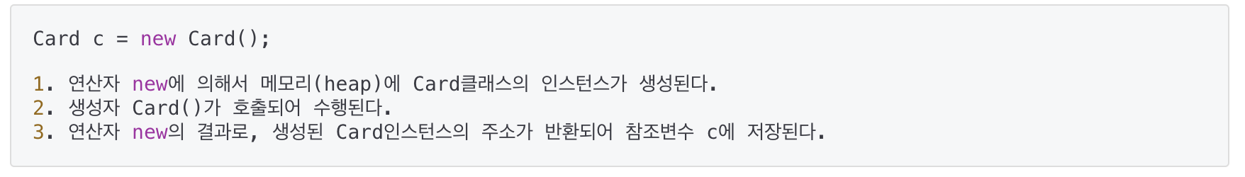 - 연산자 new 가 인스턴스를 생성하는 것이지 생성자가 인스턴스를 생성하는 것이 아니다.