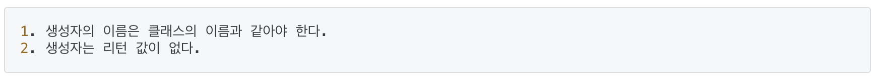 - 모든 클래스에는 반드시 하나 이상의 생성자가 정의되어 있어야 한다.
