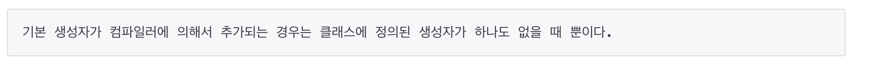 - 컴파일러가 자동적으로 기본 생성자를 추가해주는 경우는 '클래스 내에 생성자가 하나도 없을 때' 뿐이다.