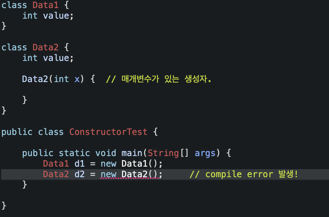 - Data1의 인스턴스를 생성하는 코드에는 에러가 없는데, Data2의 인스턴스를 생성하는 코드에서 에러가 발생하는 이유가 Data1에는 정의되어 있는 생성자가 하나도 없으므로 컴파일러가 기본 생성자를 추가해주었지만, Data2에는 이미 생성자 Data2(int x)가 정의되어 있으므로 기본 생성자가 추가되지 않았기 때문이다.