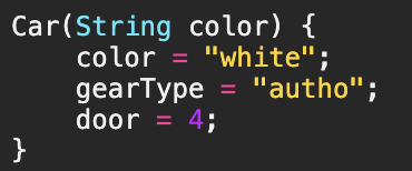 이것은 마치 실생활에서 자동차(Car인스턴스)를 생산할 때, 아무런 옵션도 주지 않으면 기본적으로 white색상에 자동변속기어(auto) 그리고 문의 개수가 4개인 자동차가 생산되도록 하는 것에 비유할 수 있다.