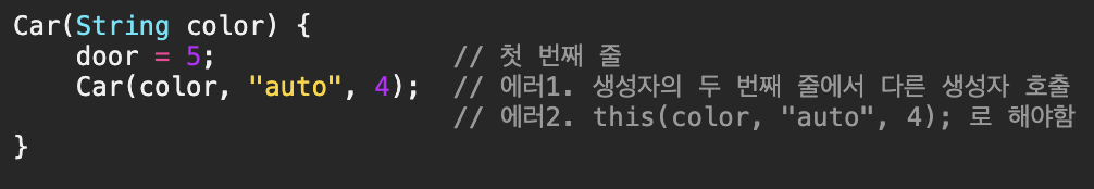 - 생성자 내에서 다른 생성자를 호출할 때는 클래스이름인 'Car' 대신 'this'를 사용해야하는데 그러지 않아서 에러이고, 또 다른 에러는 생성자 호출이 첫 번째 줄이 아닌 두번째 줄이기 때문이다.