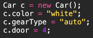 - Car c1 = new Car();와 같이 생성자Car()를 사용해서 Car인스턴스를 생성한 경우에, 인스턴스 변수는 color는 "white", gearType은 "auto", door는 4로 초기화 화 되도록 하였다.
