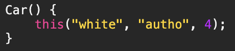 - 이처럼 생성자간의 호출에는 생성자의 이름 대신 this를 사용해야만 하므로 'Car'대신 'this'를 사용했다.