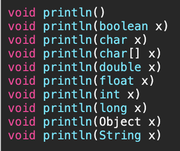 - 오버로딩의 예로 가장 대표적인 것은 println 메서드이다.