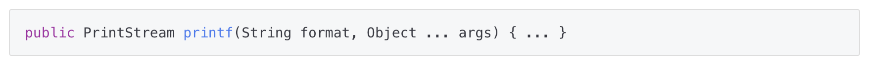 - 가변인자는 '타입... 변수명'과 같은 형식으로 선언하며, PrintStream클래스의 printf()가 대표적인 예이다.