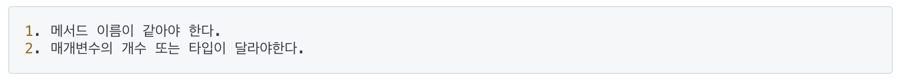 - 위 조건을 만족시키지 못하는 메서드는 중복 정의로 간주되어 컴파일 시에 에러가 발생한다.