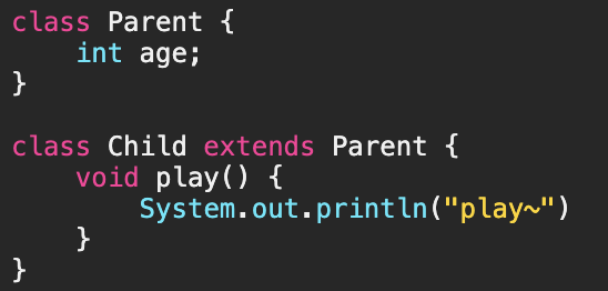 - 만일 Parent 클래스에 age라는 정수형 변수를 멤버변수로 추가하면, 자손 클래스는 조상의 멤버를 모두 상속받기 때문에, Child클래스는 자동적으로 age라는 멤머변수가 추가된 것과 같은 효과를 얻는다.