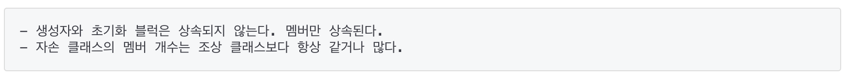- 자손 클래스는 조상 클래스의 모든 멤버를 상속받으므로 항상 조상 클래스보다 같거나 많은 멤버를 갖는다.