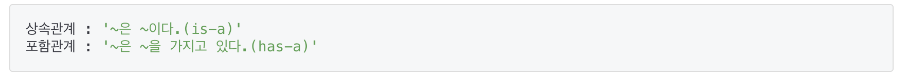 - 클래스를 가지고 문장을 만들었을 때 '~은 ~이다.'라는 문장이 성립한다면, 서로 상속관계를 맺어주고, '~은 ~을 가지고 있다.'라는 문장이 성립한다면 포함관계를 맺어준다.