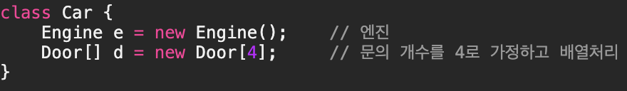 - 위와 같은 Car클래스를 작성할 때, Car클래스의 단위구성요소인 Engine, Door와 같은 클래스를 미리 작성해 놓고 이 들을 Car클래스의 멤버변수로 선언하여 포함관계를 맺어주면, 클래스를 작성하는 것도 쉽고 코드도 간결해서 이해하기 쉽다.